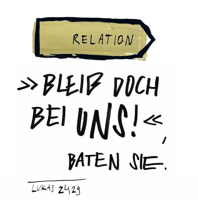 Deshalb ist es entscheidend und wegweisend, dass wir immer wieder dieses «Bleib doch bei uns!» aussprechen. Dass wir die Beziehung zu Christus immer wieder aktiv angehen. Dass wir von unseren Wunden weg auf seine blicken. Denn in der Relation zu ihm wird die Hoffnungslosigkeit zu Hoffnung, wird das Dunkel zu Licht, bricht der Himmel durch.